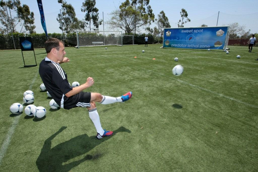 That's one of the marked zones on the Predator LZ, the sweet spot. You can see the sweet spot being demonstrated for the media at the cleat's launch last Sunday, and while Beckham's form is certainly better looking, you can see the feet are positioned in pretty much the same way. The goal of the drill was to get the ball inside one of the four open holes, which is best done like Beckham did, with a spinning dipping ball. But don't take my word for it: