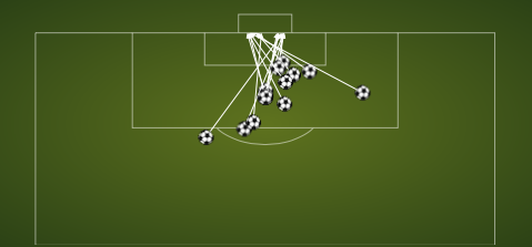 Those five goals from the spot also hurt Keane's average distance on his goals. The image above shows the location of all 16 of his goals this year, and it's clear that outside of those five at the spot there are five others taken from an even further distance. More than half his goals coming from the penalty spot or further gives him an average goal distance of 19 meters (16m for Di Vaio, 17m for Magee) which also hurts him in the Castrol Index. Further distance means more blame can be assigned to the keeper.