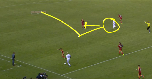 There were a few times when this gave LA players a lot of space to work in, such as this sequence which had Zardes marked by fullback Tony Beltran just after crossing the halfway line. Donovan was able to cut behind Nat Borchers and then use all that space behind Beltran creating his own shot opportunity. He was wide on the shot, but this was a non-breakaway situation where LA was able to catch RSL out of shape.