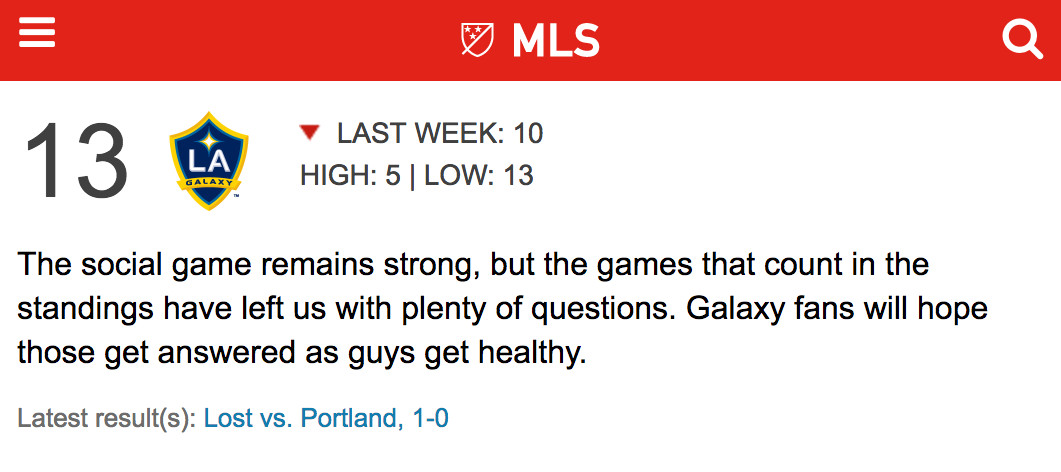 Of course, the social game is a reference to this controversial meme the Galaxy released yesterday that set off a firestorm on social media. Unfortunately as the Power Ranking Politburo notes with a twinge of soul-crushing reality, on the field where it counts, LA have zero points from two home matches.