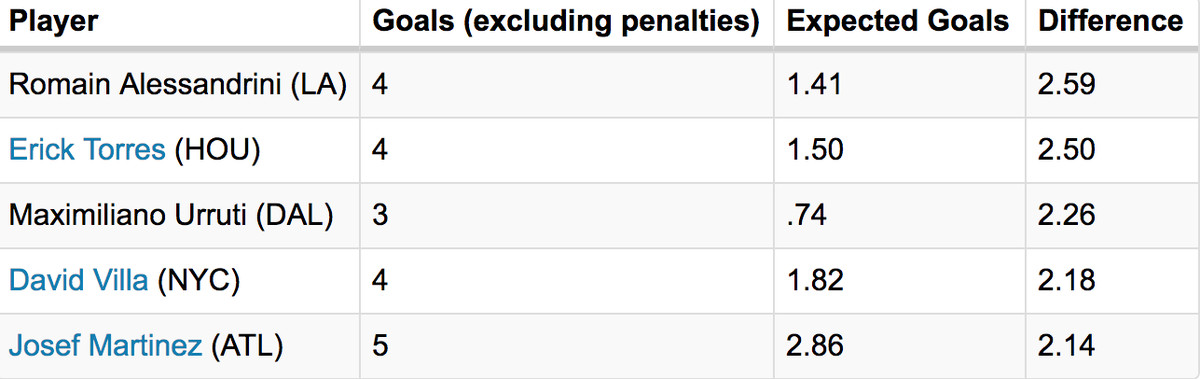 He has scored his four goals despite his shots having an expected goals value of just 1.41. This means that based on the quality of his chances he would be expected to score 1.41 goals on average. The 2.59 difference between his goals and expected goals is the largest in MLS