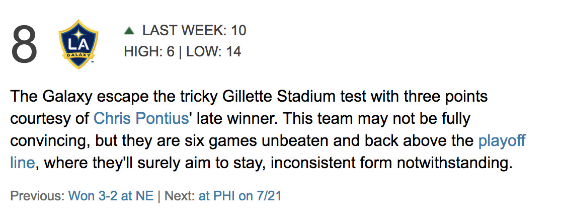 The Galaxy escape the tricky Gillette Stadium test with three points courtesy of Chris Pontius’ late winner. This team may not be fully convincing, but they are six games unbeaten and back above the playoff line, where they’ll surely aim to stay, inconsistent form notwithstanding.