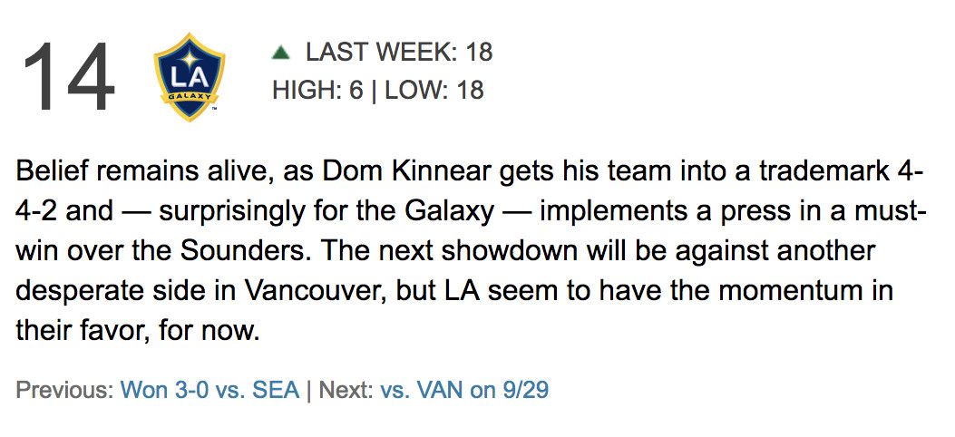 Belief remains alive, as Dom Kinnear gets his team into a trademark 4-4-2 and — surprisingly for the Galaxy — implements a press in a must-win over the Sounders. The next showdown will be against another desperate side in Vancouver, but LA seem to have the momentum in their favor, for now.