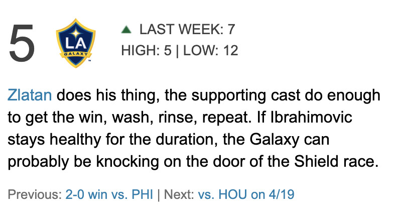 It does seem a bit questionable for Guillermo Barros Schelotto’s group to occupy the fifth spot in the rankings...after all, the blue white and gold have won five out of six to start the year. That being said, the top teams in the league (aka the Western Conferenece) will be tested in the coming weeks. LAFC travel to Vancouver before a two-legged series vs. the high flying Seattle Sounders. The Houston Dynamo, one spot above LA in the rankings, battle Zlatan and the Galaxy on the road this Friday.