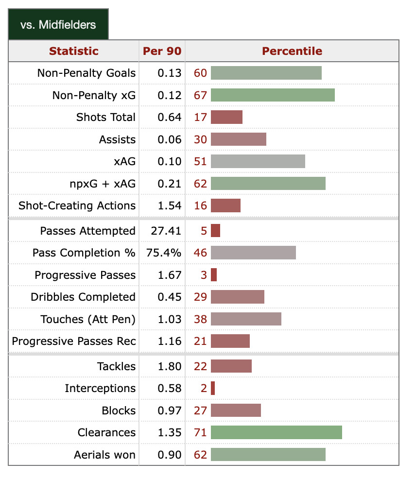 I suspect that her scouting report graph on FBref.com looks somewhat mixed as a result. She has an ability to score on the few shots she takes, and her defense in midfield is pretty good, with passing not really being her lane. However, if you’re playing a third of the time as a wide mid, a third as a defensive mid, and a third as an attacking mid, your job game to game is substantially different, even if it’s all midfield. So I think this isn’t entirely representative of what she can do.